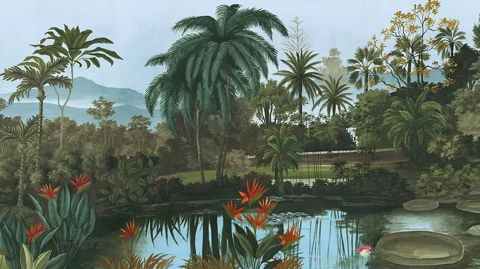 An exotic stroll in this garden at the other end of the world … large waterlilies float on the bluish waters of the lake, interspersed with stylised reflections of lush vegetation.