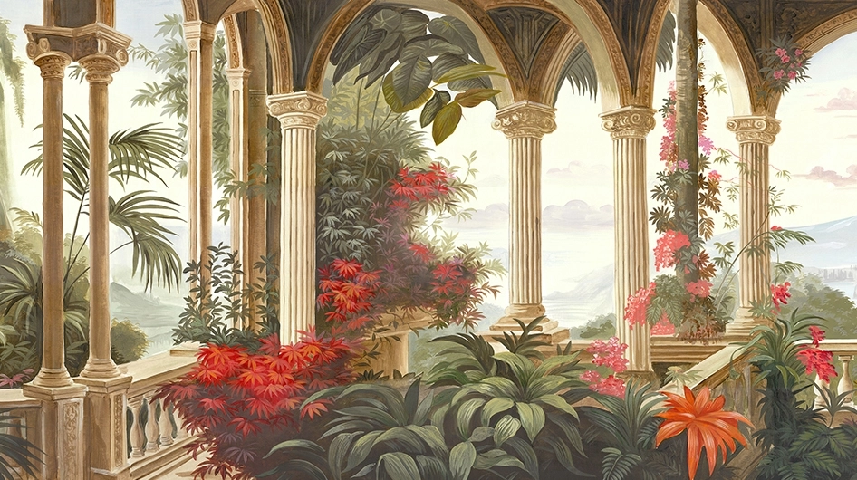 Light streams down the columns of this faded Indian garden…A balcony on the world. In the distance, the mountains of Rajasthan. Time fades, all that remains is motionless splendor.