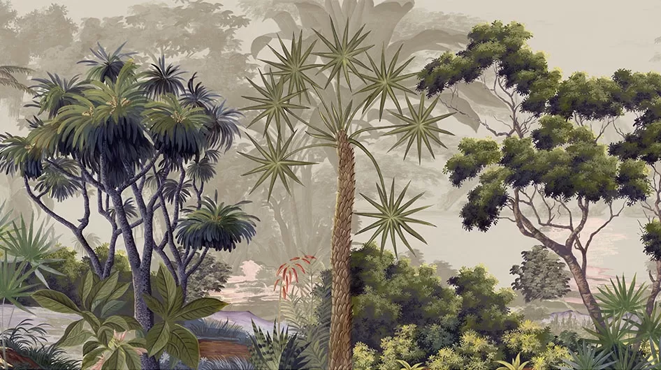 The scenery takes us for a walk in a botany garden. The vegetal pattern of the beige background gives it all its decorative dimension.